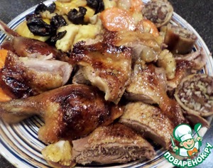 Гусь — крупная домашняя птица, одомашненная от серого гуся (Anser anser) тысячи лет назад в Европе и Азии. Мясо гуся характеризуется плотной волокнистой структурой и преобладанием тёмных мышц, а также значительной жировой прослойкой под кожей. Жир обеспечивает сочность при длительной тепловой обработке, а кожа после запекания становится хрустящей и ароматной. Благодаря этим свойствам гусь традиционно ценится для праздничной кухни и праздничных застолий. Вкусовые качества гуся можно описать как насыщенные, слегка «дичавые», с выраженной мясной сладостью и глубиной, которую удачно подчёркивают специи, фрукты и кислые соусы — тмин, тимьян, яблоки, клюква или красное вино. В кулинарии гусей обычно запекают целиком, фаршируют, готовят конфи, коптят или используют в колбасах и паштетах; печень нередко идёт на фуа‑гра. Гусиный жир — отдельный ценный продукт: на нём жарят, запекают картофель и овощи, а также используют в консервации и для хранения продуктов. Интересные факты: исторически гусь был важен не только как пищевой ресурс, но и как символ праздников — в ряде стран его готовили на День святого Мартина и Рождество. Разные породы разводят ради мяса, пера и пуха; методы откорма заметно влияют на вкус и текстуру мяса. С точки зрения питания, гусиное мясо богато белком, железом и витаминами группы B, однако содержит значительное количество насыщенных жиров, поэтому рекомендуется умеренное потребление.